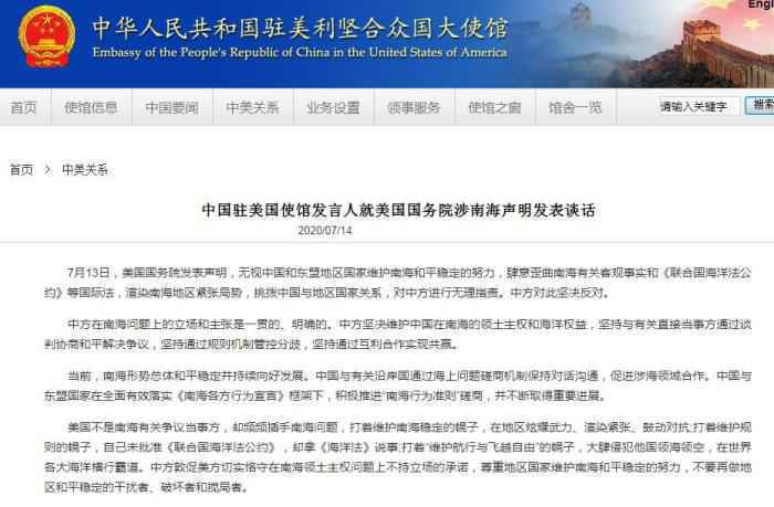 中国驻美使馆:坚决反对美国国务院涉南海声明