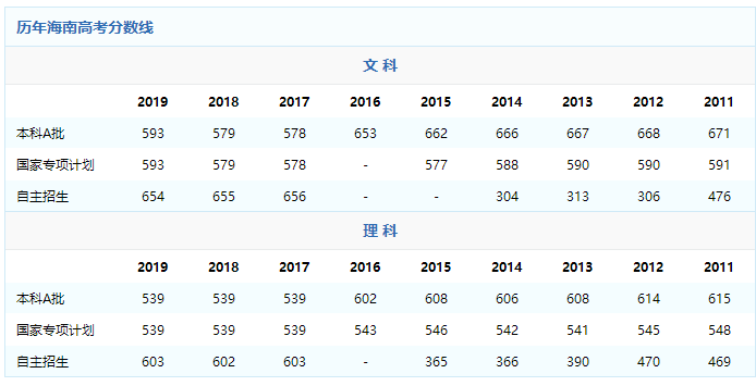 海南历年分数线一览