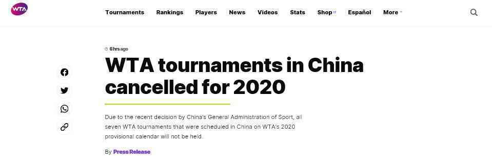 同时,原定在2020临时赛历上的七项WTA赛事:中国网球公开赛(北京)、东风汽车武汉网球公开赛、江西网球公开赛(南昌)、郑州网球公开赛、资生堂·深圳WTA年终总决赛、横琴人寿珠海WTA超级精英赛、广州国际女子网球公开赛也将取消举办。